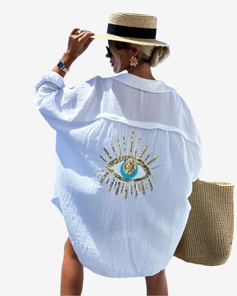 Introducing a sequinned shirt designed to highlight your natural beauty while remaining stylish and comfortable. This shirt combines a loose, oversized fit with a stunning eye motif embroidered with sequins and pearls on the back, adding a touch of unique elegance to a relaxed look. Whether you're going on a stylish outing or just relaxing, the sequinned shirt offers the perfect balance between chic design and all-day comfort.